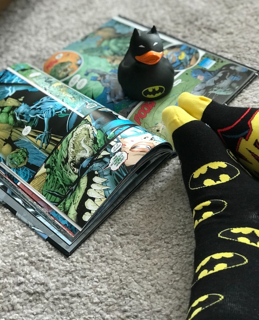 Når girafpingvin-sokkerne ryger, og Batman-sokkerne kommer på, svinger jeg batanden og læser tegneserier. Hvad er din favorit? 🦇📖
