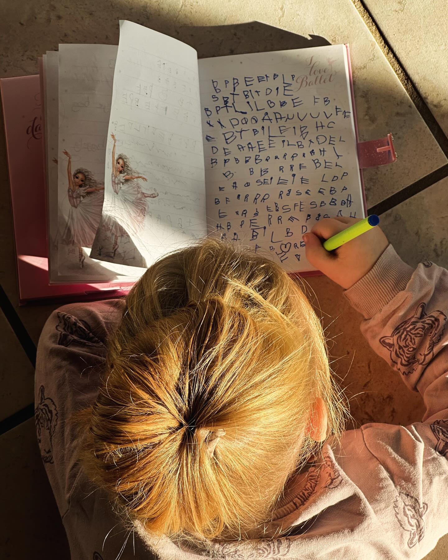 Tilde mener hun kan skrive nissesprog. Så her er hun i gang med et langt brev til Rumle hvor hun siger tak for gaverne og fortæller om sin dag 😍❤️