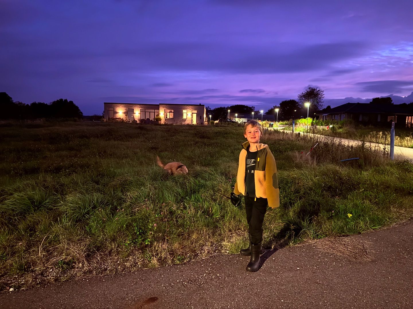 Bahloo 🐶 Magnus og jeg ✨ startede dagen med en magisk morgentur. Sjældent har jeg set en himmel så lilla 💜... Mon den har besøgt enhjørningernes land i nat? 🦄🌟🚀 😂(der hvor girafpingvinerne også bor)🌈