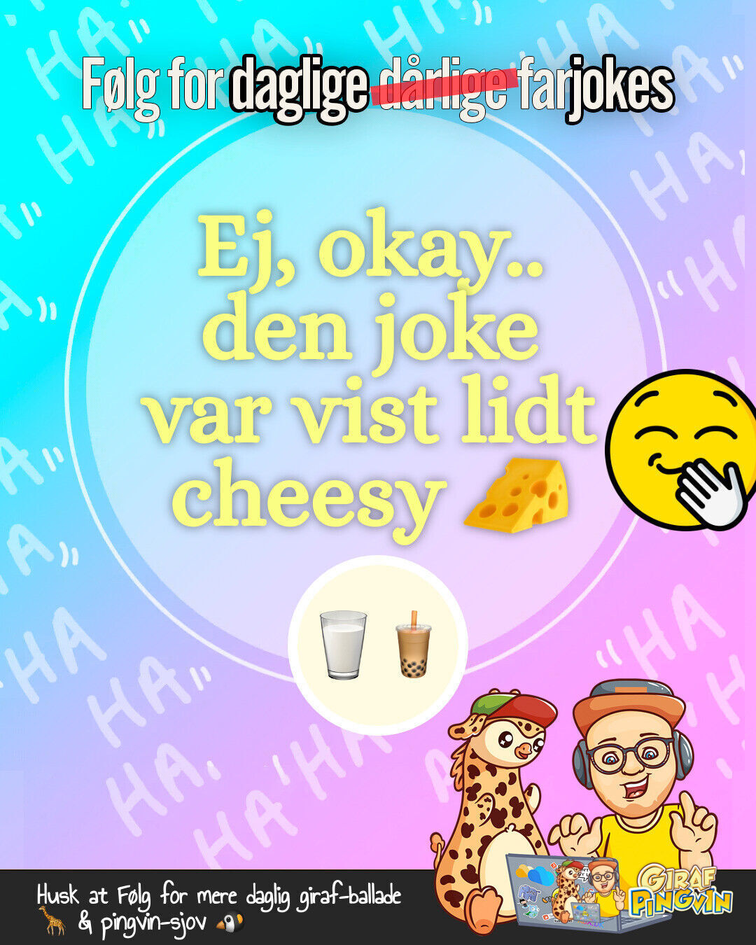 Det var alt for i dag, mine GirafPingvin'er! Hold jer friske som en minimælk og blød som en havarti! 😉🧀🎉 Vi ses i morgen