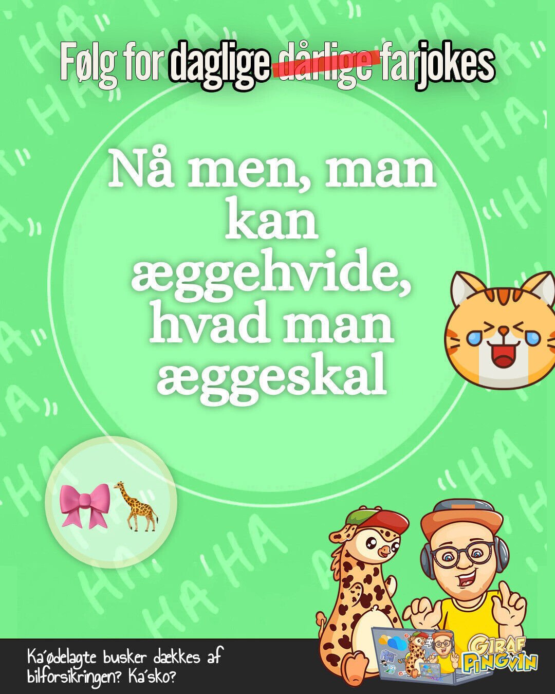 Hej gode venner!👋🦒🐧 Klar til girafpingvin-humor? 😂 Kan munke skyde? Nonner? Selv min kone rystede på hovedet! 🤷♂️ Æggehvide, hvad man æggeskal! 🍳😄 Grin hver dag! 🌻🐧🦒