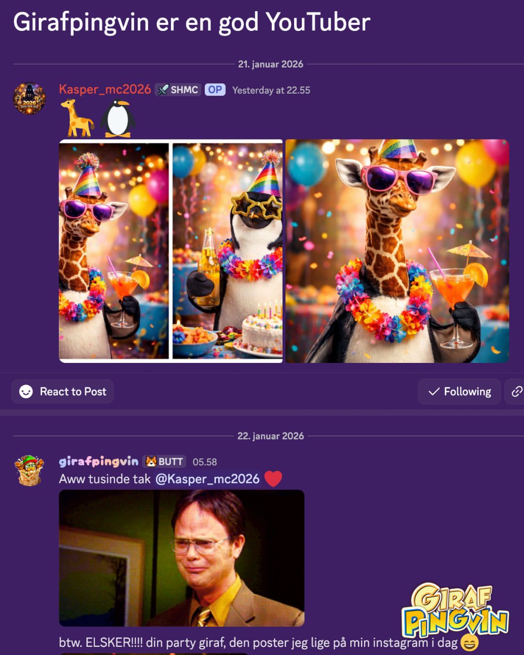 Nogle gange kommer de med posten (jeg har en hel væg herhjemme fyldt med jeres giraf'tastiske kunst ✨), og andre gange lander de på min Discord-server 🐧🦒