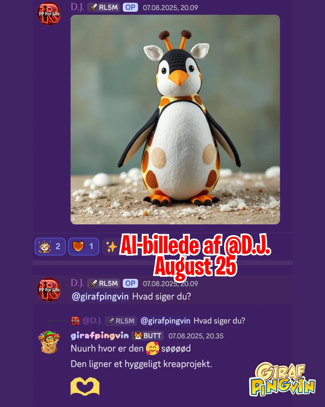 Kreative sjæle sender fantastisk girafpingvin-kunst til min væg og Discord! Fra post til Photoshop, udviklingen er magisk. Elsker jeres vildskab! 🐧🦒✨🤯🔥