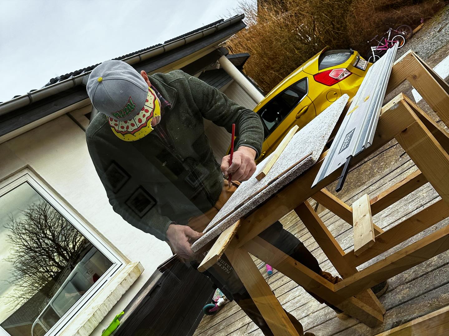 Girafpingvin giver den gas som tømrerlærling og drømmer om loft-forvandling! 🌙🐧😴 Tjek den vilde tømrermester-stil! 🔨🙀💛