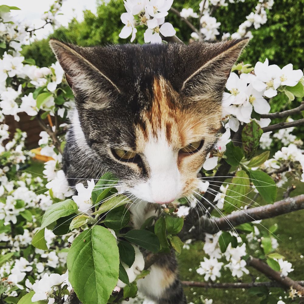 Vores kære kat My har været ekstra aktiv i dag og brugt meget tid under det gamle æbletræ i haven.