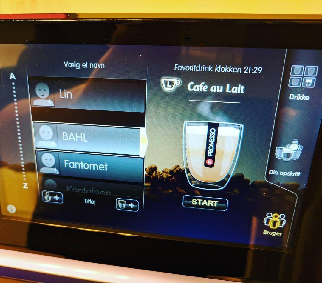 Det er perfekt, når den nye awesome kaffemaskine på kontoret holder styr på det hele. Favoritdrink kl. 21:29 er åbenbart en bøzbøz med ekstra mælk 😋😆