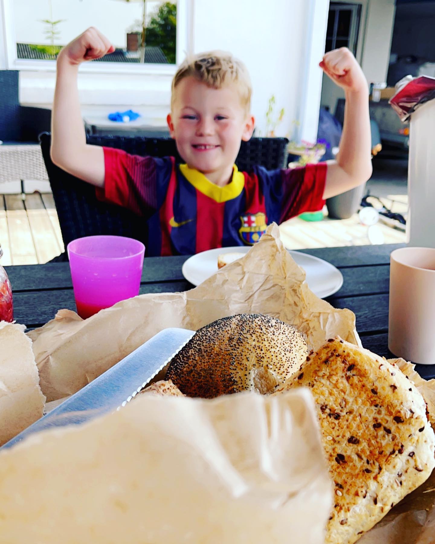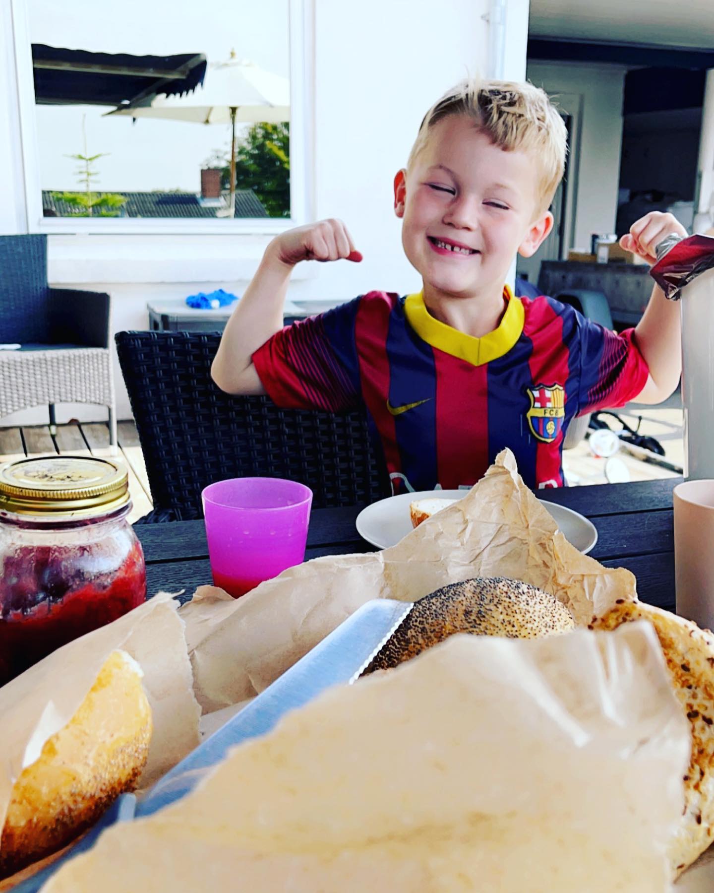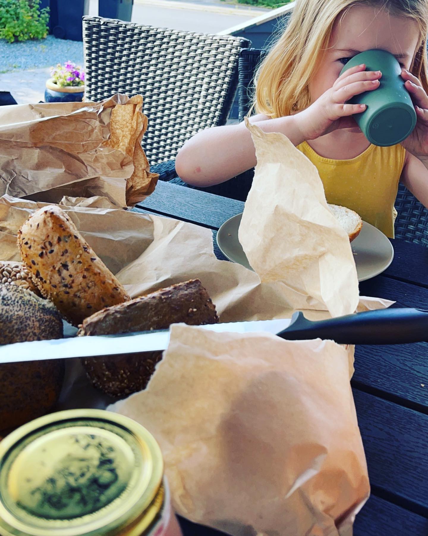I dag var det dejligt vejr lige fra morgenstunden, så Tilde og jeg besluttede at hente rundstykker ved bageren og spise ude på terrassen.