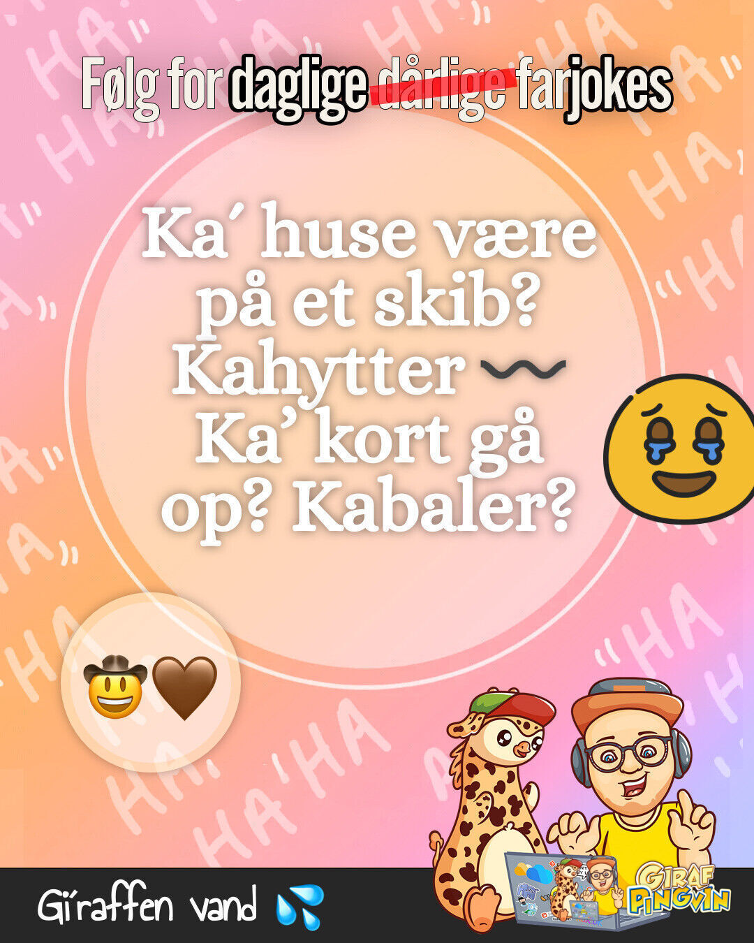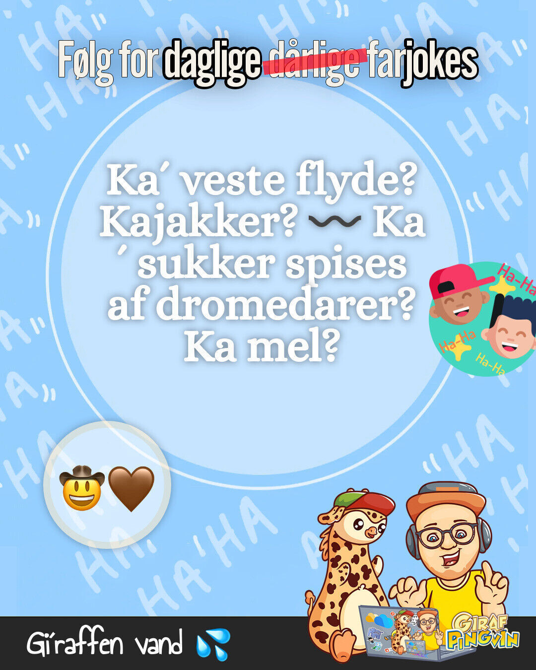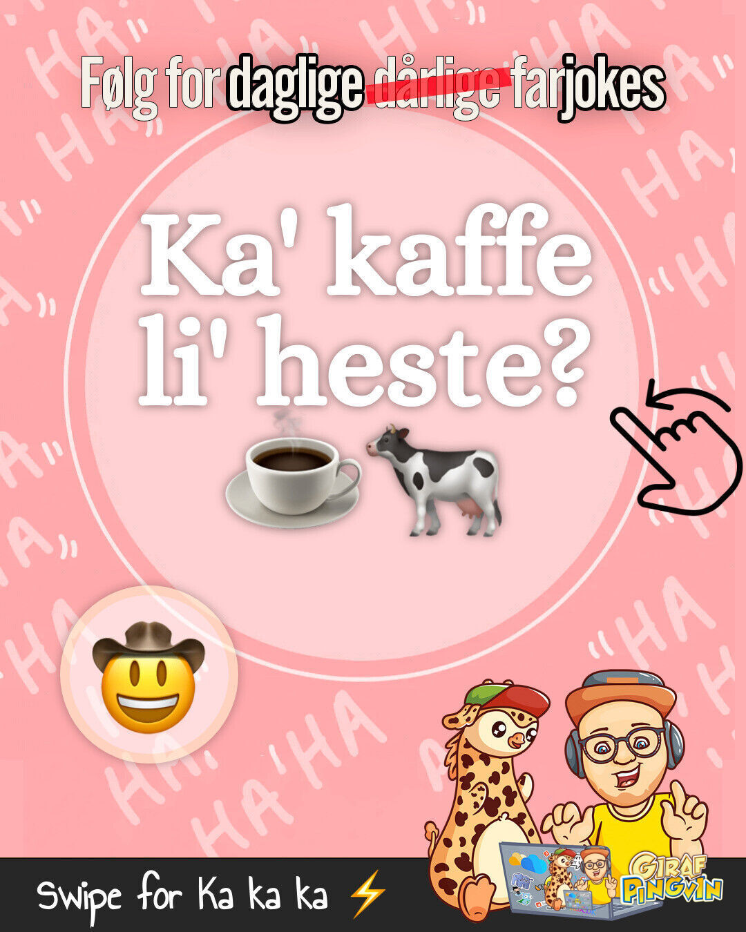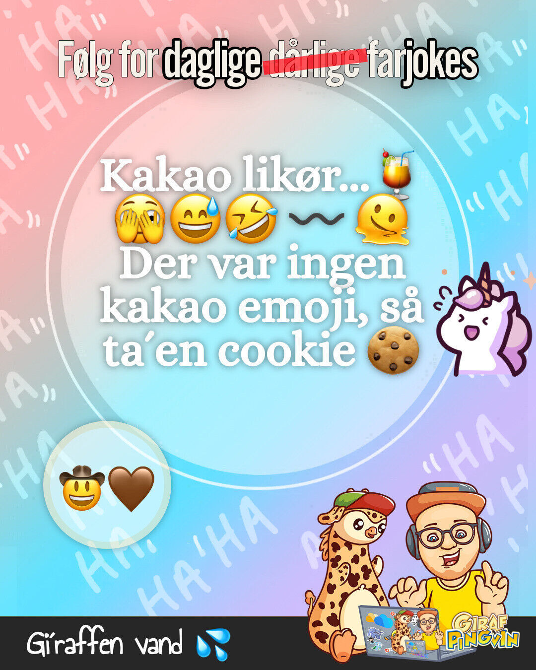 Girafpingvinen har set en kaffebønne ride på en hest og nyde kakao likør! Altid tænk kreativt og grin mere 🦒🐧😂☕🐎🍹🍪