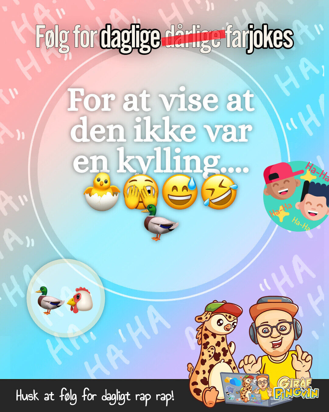 Husk venner... Vi alle har vores egne veje at krydse i livet. Sรฅ hvad enten du er en kylling ๐, en and ๐ฆ, eller en giraf ๐ฆ, skal du huske at gรธre det med stolthed og et stort grin! ๐