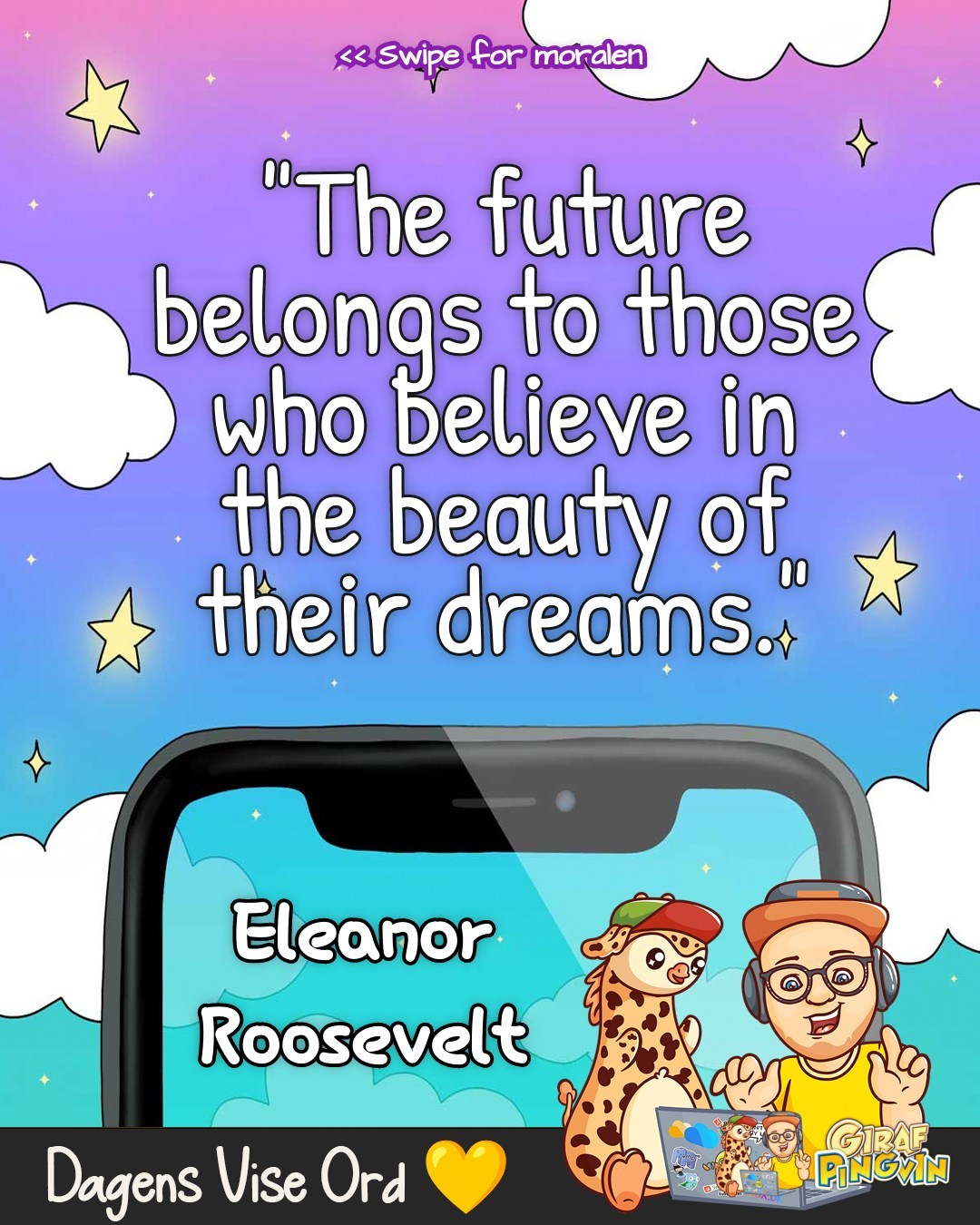 I dag vil jeg dele en tanke, der virkelig har haft indflydelse på mit liv. Der er et kraftfuldt citat fra en stor dame, der hedder Anna Eleanor Roosevelt, nemlig Fremtiden tilhører dem, der tror på skønheden af deres drømme. 🚀✨