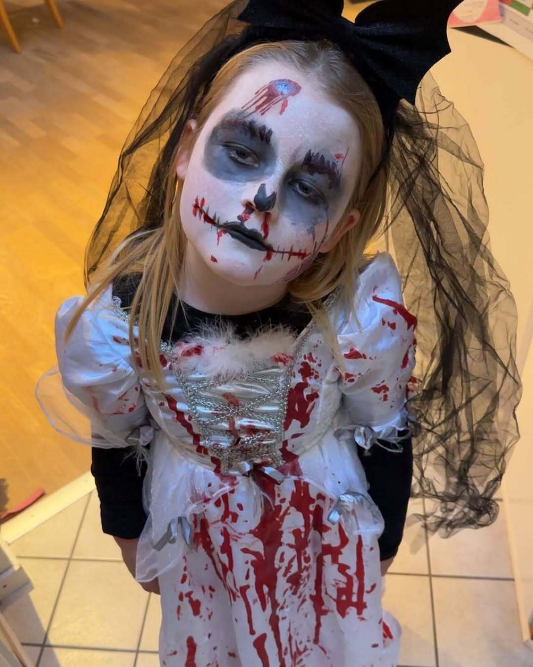 🧟♀️ Tilde er klar som Zombie Brud! Med udtrykket af en uhyggelig skønhed er hun klar til at skræmme livet af os i aften. 🙀🤩👻🫣 Er I klar til at blive skræmt? 😱