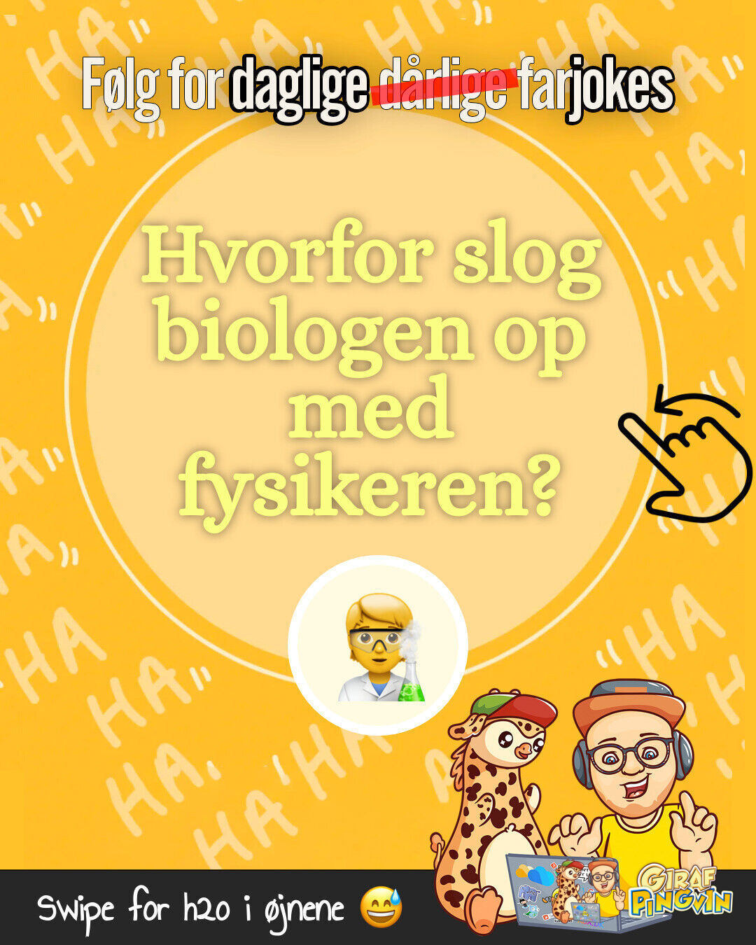Når biologer og fysikere går fra hinanden: Totalt mangel på kemi! 😂🧑🏻🔬🧪 Få flere datingtips fra din lokale girafpingvin! 😜🦒🐧