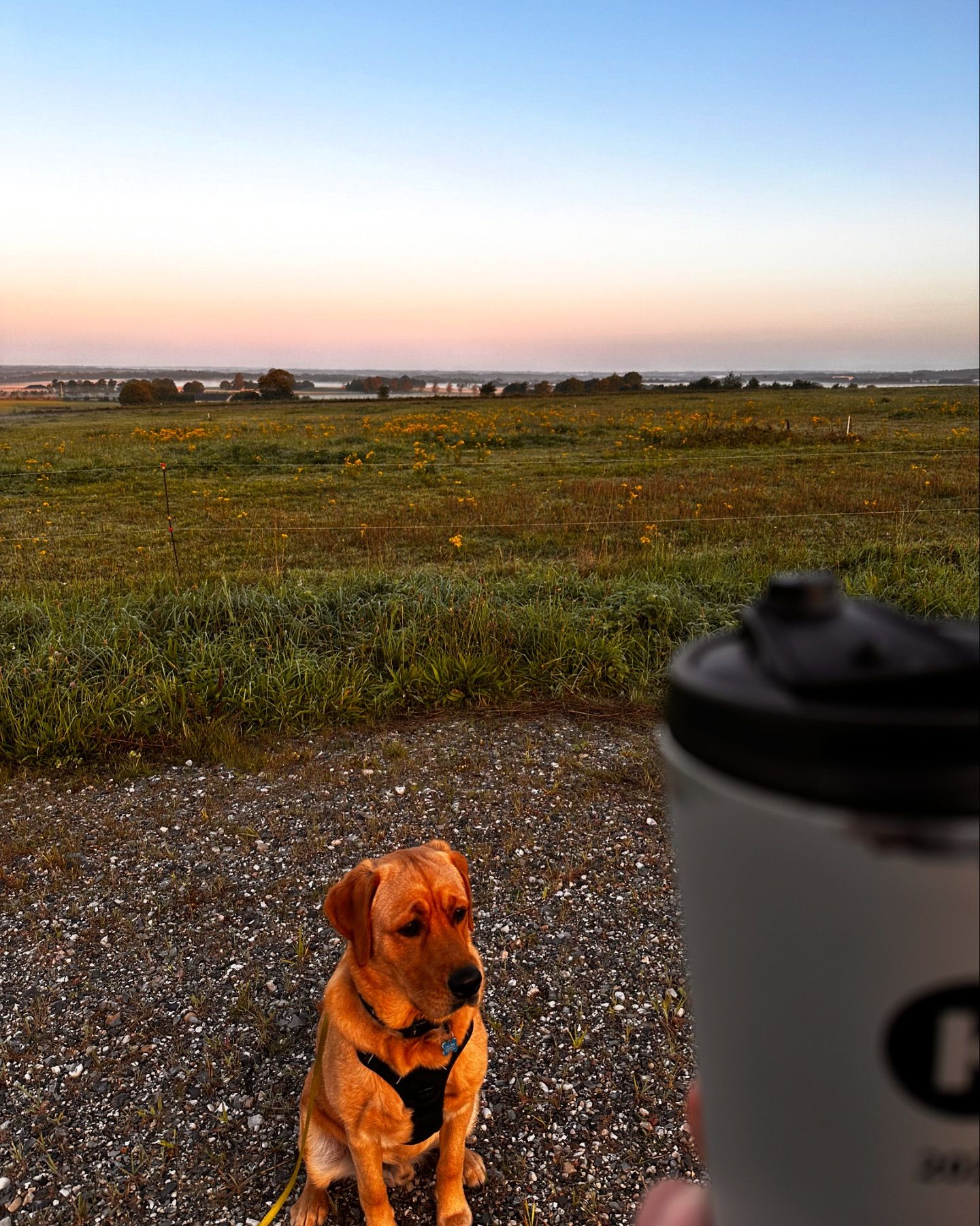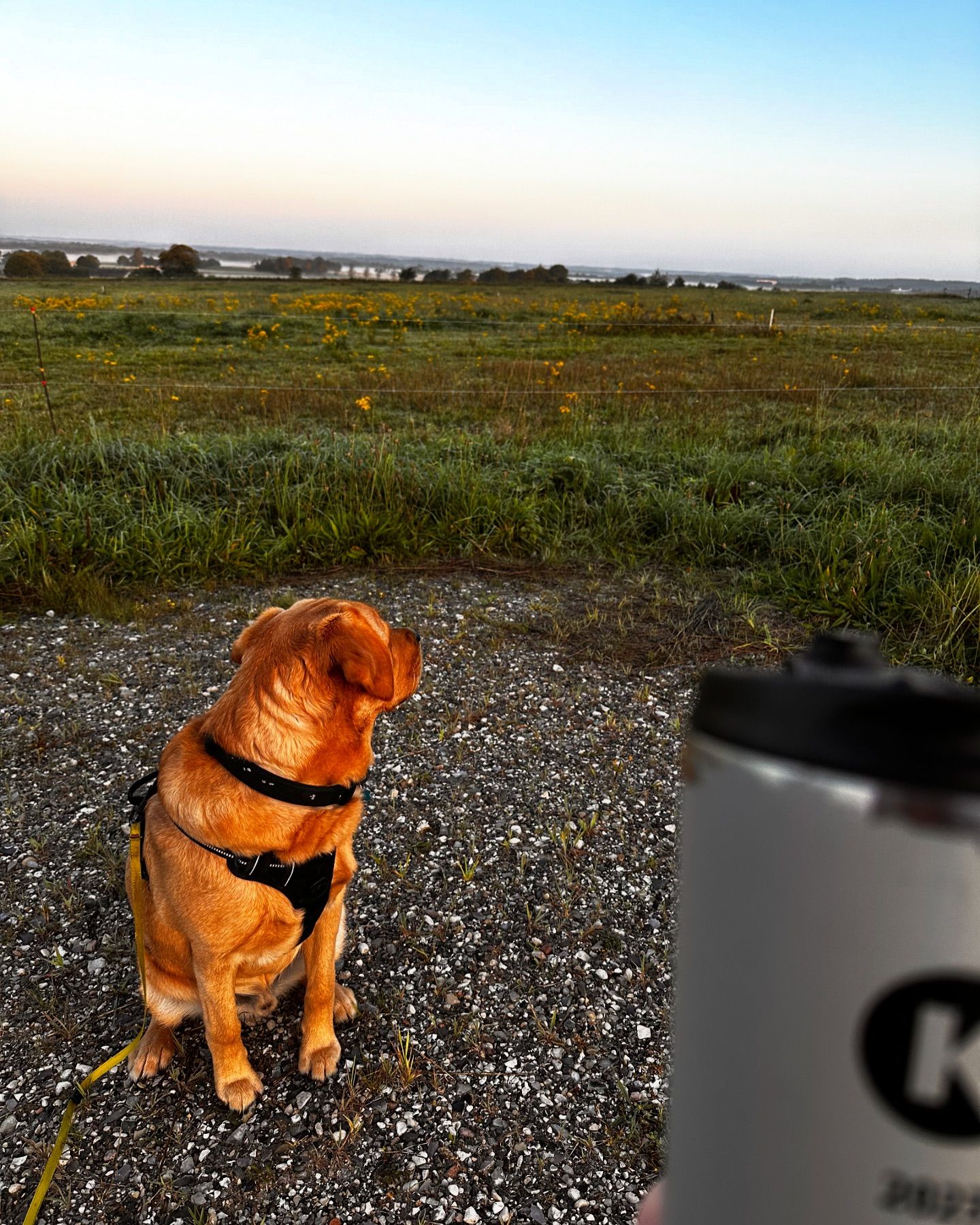 I dag starter Bahloo 🐶 og jeg ud med en dejlig gåtur i tågebakkerne 🌫️🏞️. En lomme fuld af godbidder til Bahloo 🍖 og en varm kaffe til farmand ☕.