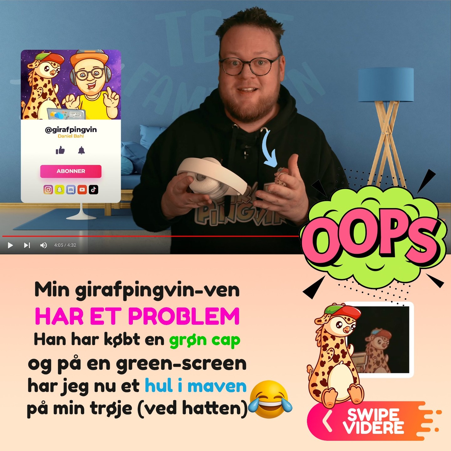 Min bedste ven, Girafpingvin, har købt en ny hat - den er grøn. Problemet er bare, at på en green-screen har jeg nu et hul i maven på min trøje (ved hatten) 😄 Det dur jo ikke, så jeg skal ud og købe en ny cap til ham. Jeg poster lige en række forskellige valgmuligheder!