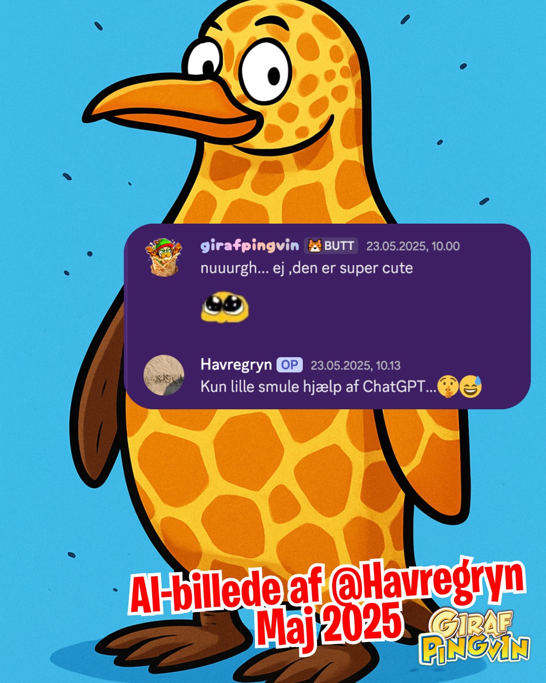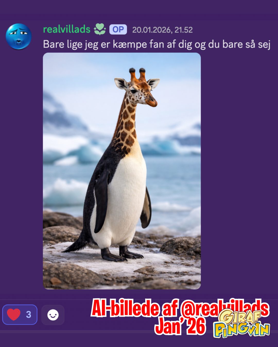 Kreative sjæle sender fantastisk girafpingvin-kunst til min væg og Discord! Fra post til Photoshop, udviklingen er magisk. Elsker jeres vildskab! 🐧🦒✨🤯🔥