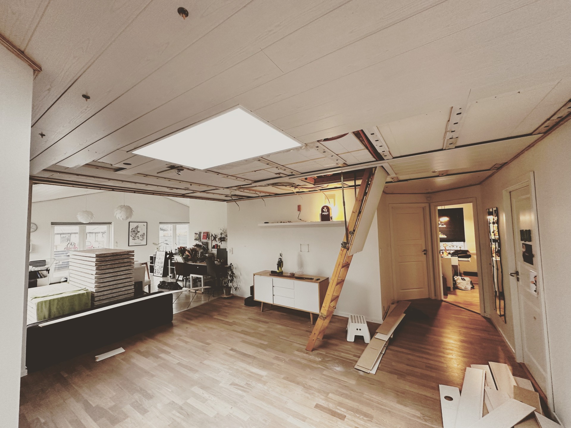 Farvel vandskadet loft 😭, hej Troldtekt og nye spots 🎉🔨 Kom så PostNord, vi venter på lys-showet fra Hue! 🚚⚡😜