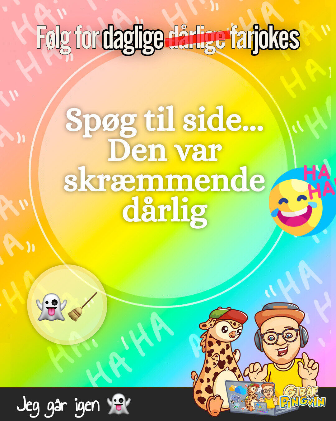 Velkommen til girafpingvin-farhumor! Klar til en plat vits, så uhyggelig selv spøgelser skriger? 👻😱 P.S. Leder du efter spøgelsesjægere? Ikke mig, jeg laver dårlige vittigheder 😆