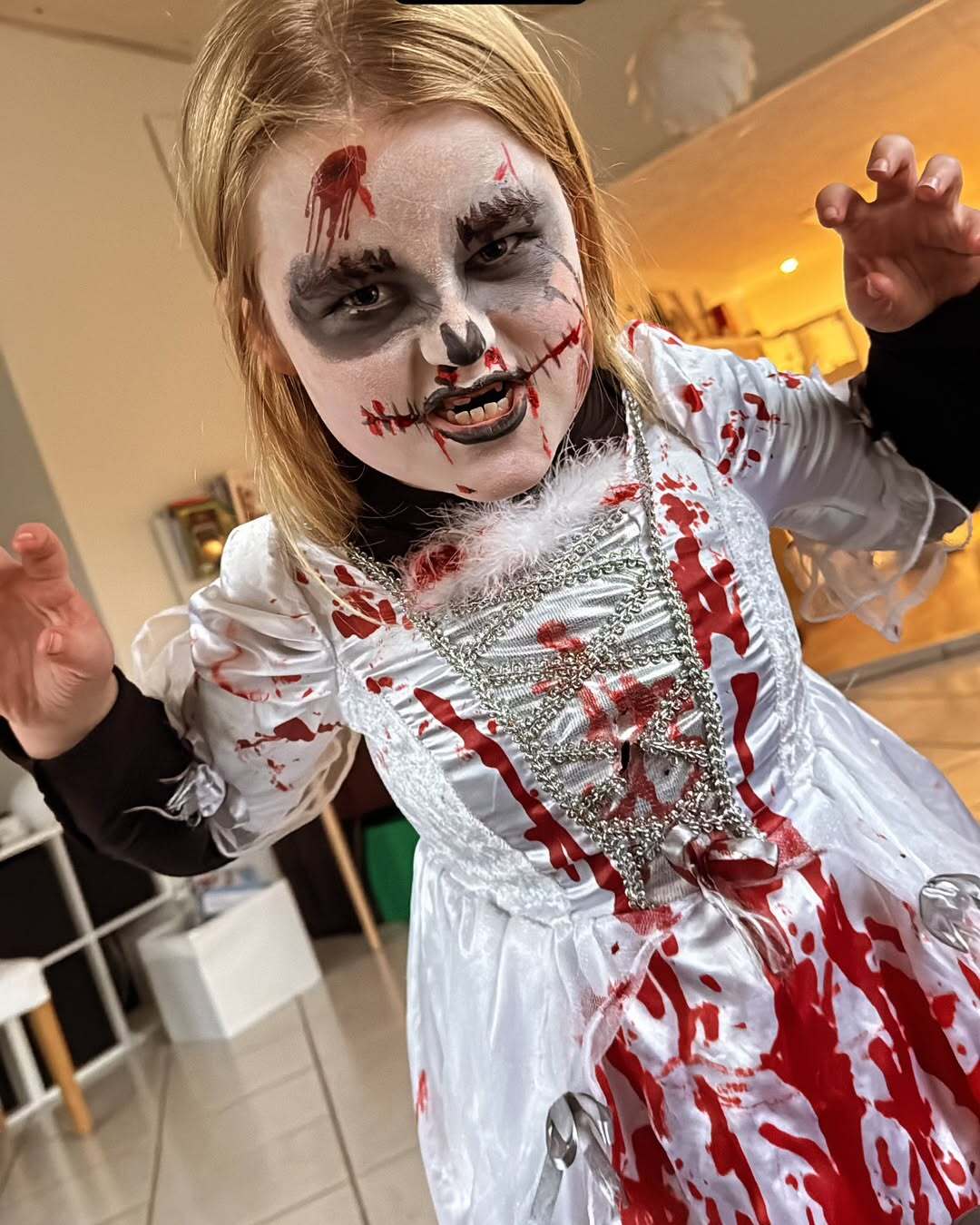 🧟♀️ Tilde er klar som Zombie Brud! Med udtrykket af en uhyggelig skønhed er hun klar til at skræmme livet af os i aften. 🙀🤩👻🫣 Er I klar til at blive skræmt? 😱